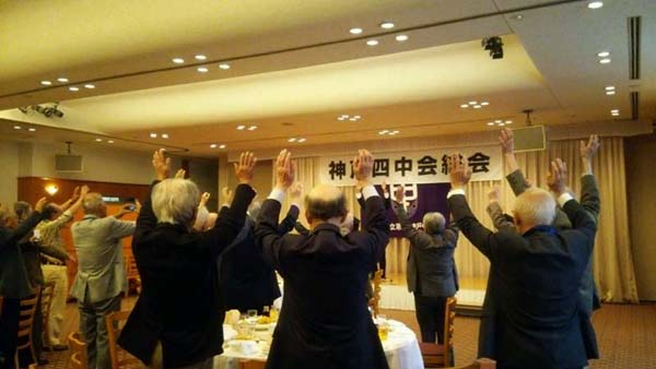 フィナーレでは、青木誠氏(四中4)の先導で37名全員が「四中学徒の歌」を精いっぱい合唱。山田勝巳会長の掛け声で万歳を三唱し、最後の神戸四中総会は閉会となりました。